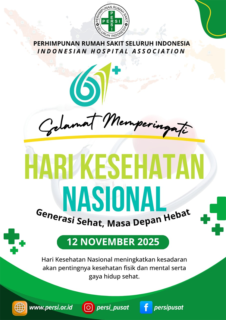Perhimpunan Rumah Sakit Seluruh Indonesia (PERSI) mengucapkan selamat Hari Kesehatan Nasional 2025 kepada insan hospitalia serta para pegiat kesehatan nasional lainnya. Peringatan yang jatuh pada 12 November menjadi momentum bagi kalangan rumah sakit dan masyarakat untuk mengupayakan secara optimal ...