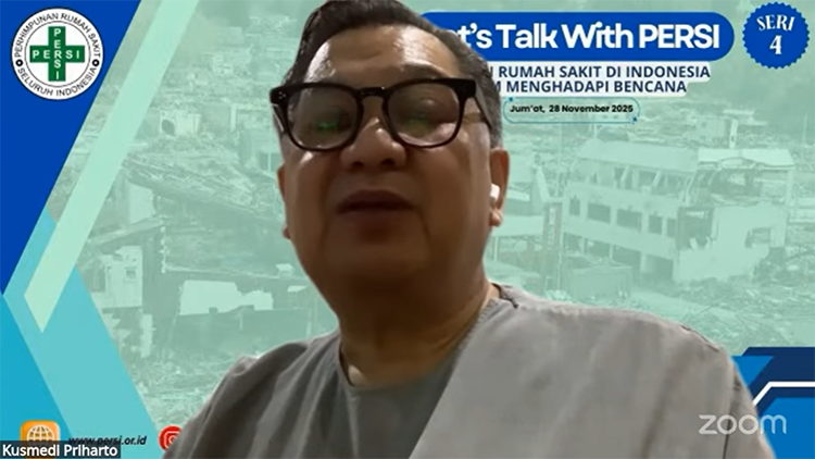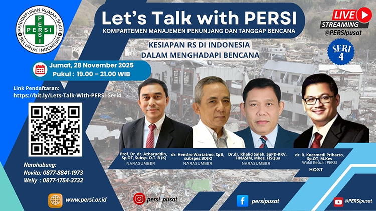 Demikian terungkap dalam diskusi Let’s Talk with PERSI seri ke-4 yang menghadirkan Kompartemen Manajemen Penunjang dan Tanggap Bencana PERSI Pusat dengan topik Kesiapan RS di Indonesia dalam Menghadapi Bencana. Diskusi melalui Webinar dan YouTube PERSI Pusat secara langsung itu diselenggarakan pada Jumat, 28 November 2025.
