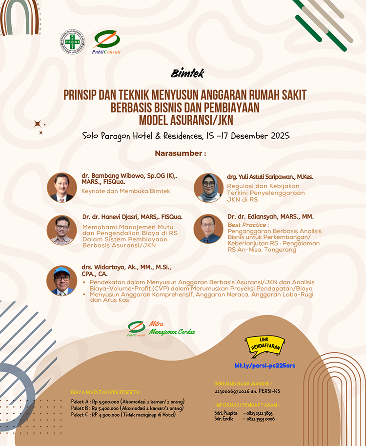 Selama ini RS telah biasa menyusun anggaran, tetapi kebanyakan masih dengan pendekatan sederhana dan konvensional, belum berbasis teknik analisis biaya yang memadai. Hal ini terjadi karena pemahaman konsep biaya yang terbatas dan belum terbangunnya budaya akuntansi biaya pelayanan medis yang baik. bimtek ini diselenggarakan untuk membekali direksi, manajer dan pengelola keuangan RS dengan pemahaman dan keterampilan praktis dalam menyusun anggaran yang akurat dan responsif terhadap model pembiayaan saat ini.