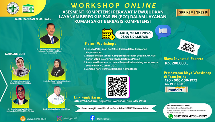 - Daftarkan diri melalui registrasi online pada link berikut : https://bit.ly/Form-Registrasi-Workshop-PCC-Mei-2026 Masing – masing wajib mengisi NIK, nama lengkap dan gelar nama RS/Instansi/Organisasi, Jabatan, No. HP dengan WhatsApp aktif, Alamat email (mohon langsung bergabung melalui link wa group)