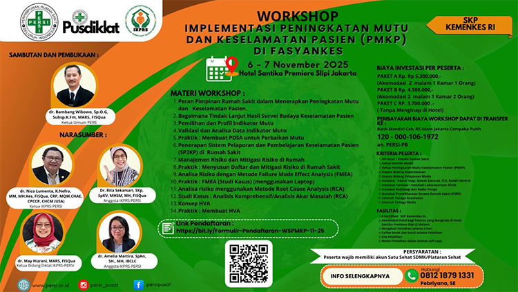 Kegiatan Workshop Implementasi Peningkatan Mutu dan Keselamatan Pasien (PMKP) di Fasyankes bekerjasama dengan Pusdiklat PKU Muhammadiyah sebagai Lembaga Terakreditasi “A” Ditmutu Kementerian Kesehatan RI dengan Nomor SK : HK.02.02/F/3955/2024 Kontak Person : Sdr. Pebriyana (0812-1879-1331) Pusdiklat PKU Muhammadiyah : Admin (0821-1787-2760)
